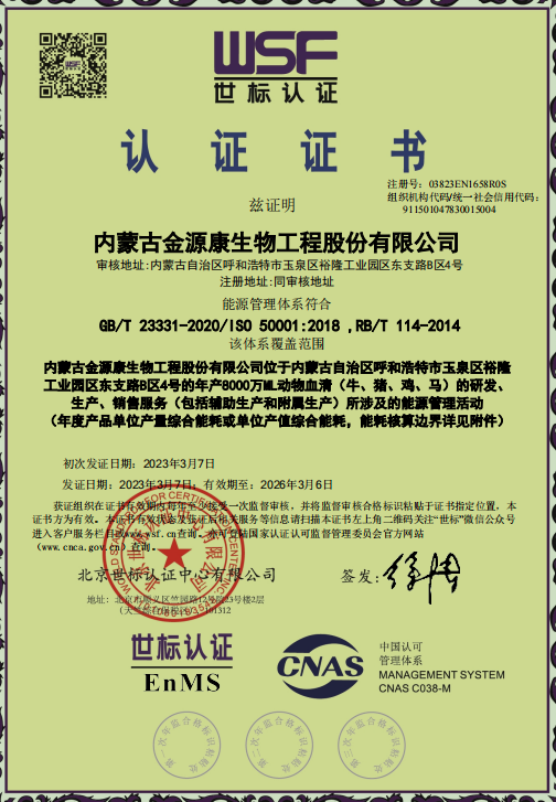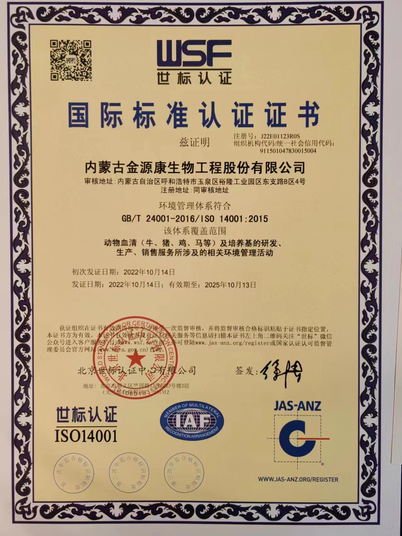 内蒙古金源康生物工程股份有限公司成立于2005年,是一家专注于动物血清、培养基、疫苗佐剂、细胞库及周边产品等研发与生产应用为一体的国家级高新技术企业,公司旗下两家全资子公司:内蒙古金源康生物工程股份有限公司 上海自由贸易试验区分公司与内蒙古奥普赛生物科技有限公司。作为国产血清标杆企业,公司始终秉承科技、创新、品质为价值导向,推动生命产业发展为使命,致力于成为世界第一的"细胞"服务商。 公司先后通过了"牛血清生产质量达标企业"和"细胞培养基生产质量达标业”、ISO9001、ISO14001等7项管理体系认证,荣获国家高新技术企业、国家级绿色工厂、国家知识产权优势企业、自治区专精特新中小企业、自治区企业技术中心、自治区企业研发中心、自治区农牧业产业化重点龙头企业等多项国家、省部级荣誉。